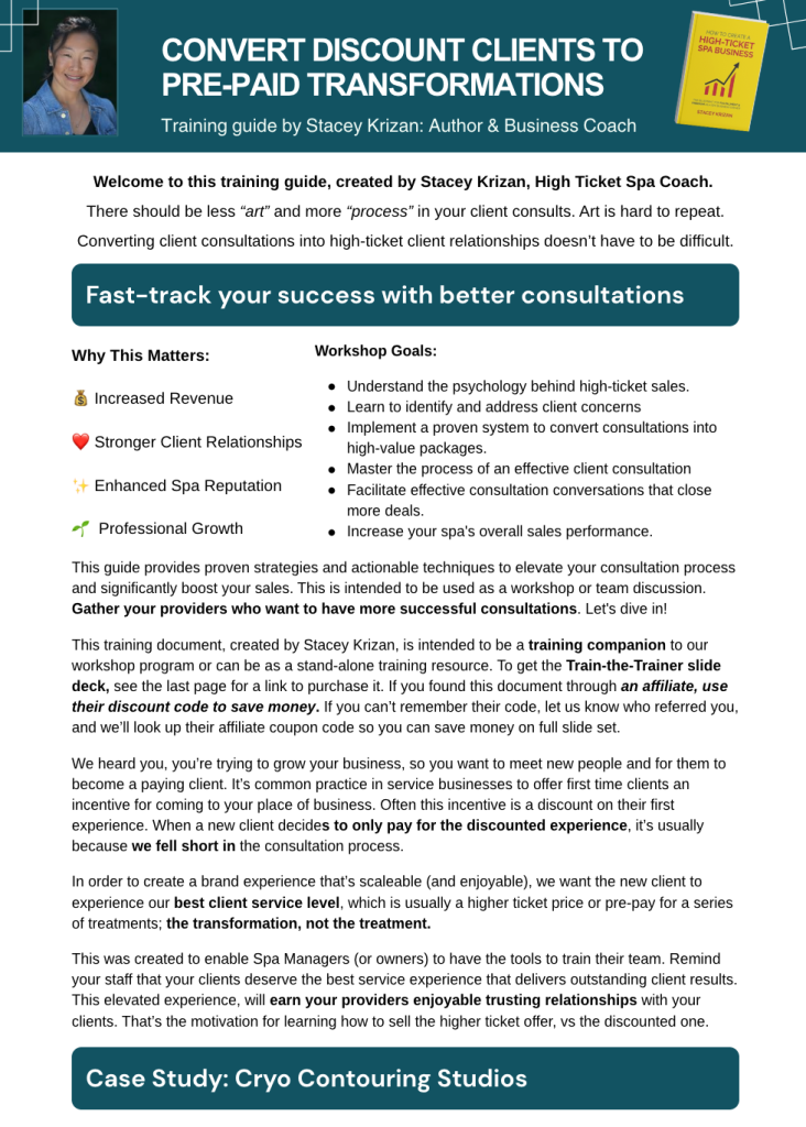 Find clarity, confidence, and a practical path to profitability with “How to Create A High-Ticket Spa Business” by Stacey Krizan. Tailored specifically for spa business owners, this guide demystifies the journey from burnout to empowerment—without generic fluff.